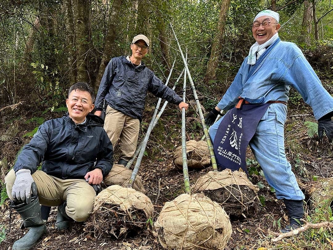 牧野博士は来春はNHK朝ドラ「らんまん」のモデルとして取り上げて頂いており、これから更に沢山のお客様にご来園いただけると予想されています。そこで、全国の皆様に高知県特有の虎竹をご覧いただければと思い、山の職人と共に3日間竹林に入り厳選した美しい虎竹を掘り上げ運んでいきました。