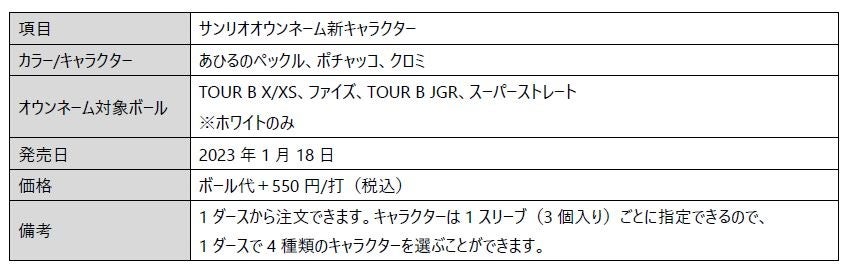 『サンリオキャラクターオウンネーム』は、対象のゴルフボールに好きなサンリオキャラクターをプリントできる有料サービスで、このたび取り扱いキャラクターを3種類追加いたします。サンリオキャラクター大賞においても近年上位にランクインし再注目される「あひるのペックル」「ポチャッコ」に、日本国内だけでなく海外においても人気を誇る「クロミ」の 3種類のキャラクターを追加して展開します。1ダースにつき4種類までキャラクターを選んで注文することができる※2 ため、自分好みにカスタマイズしたボールで、お客様がより一層ゴルフを楽しんでいただけるオウンネームサービスです。