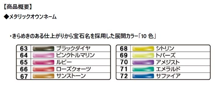 『メタリックオウンネーム』は、メタリック調のインクを使用したオウンネームサービスで、当社オリジナルのおすすめ オウンネームマークだけでなく、好きな文字内容・デザインの印刷が可能です。10色の多彩なカラーバリエーション、 きらめきのある仕上がりにより、贈り物・お祝い事にも最適です。