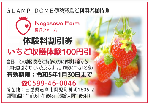 1月5日(木)~1月31日(火)までご利用いただける割引券がございます。(定価から100円引き)チェックインもしくチェックアウト時にいちご狩り体験をご予約された旨をお伝えいただきグランドーム伊勢賢島の従業員から割引券のお渡しとなります。