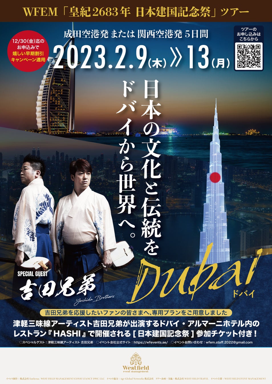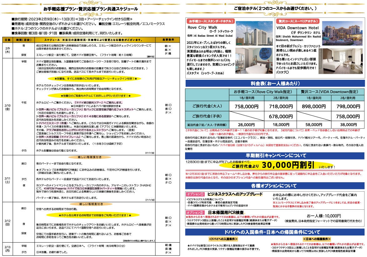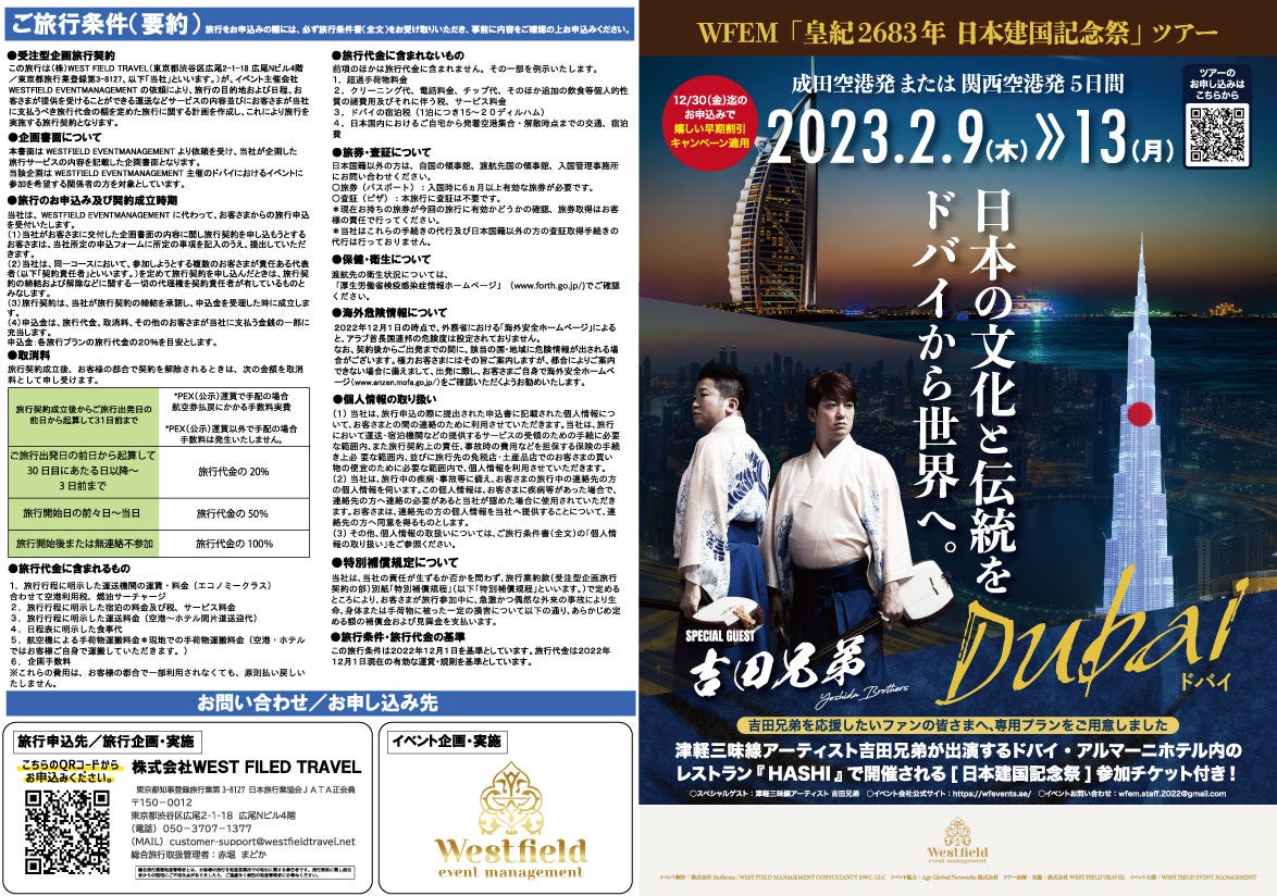 吉田兄弟応援ツアーとして、イベント参加希望者専用の旅行プランが用意されており、『皇紀2683年日本建国記念祭』参加チケット付きで、近未来都市ドバイを堪能できる。2022年12月30日(金)までの申込みで嬉しい早期割引キャンペーンの適用も。