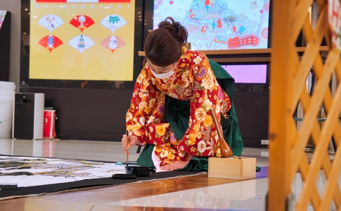 皆様にも書初めをご体験いただけます。書道家 美紗稀氏ご指導のもと、100cm×150cmの大きな書初め用紙にお好きな漢字一字とお名前をモップ筆でお書きいただけます。作品は記念にお持ち帰りいただけます。