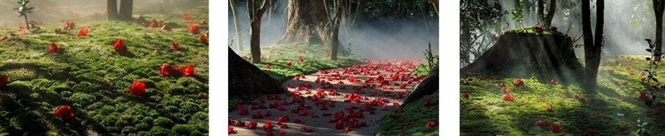 「椿絵巻~東京椿インスタレーション・アート~」は、椿(ヤブツバキ)の大樹の下にふわりと舞い降りた赤い椿と、緑深き苔の美しいコントラストを庭園の山頂エリアにてご覧いただける「絵巻物」のような美しい光景です。