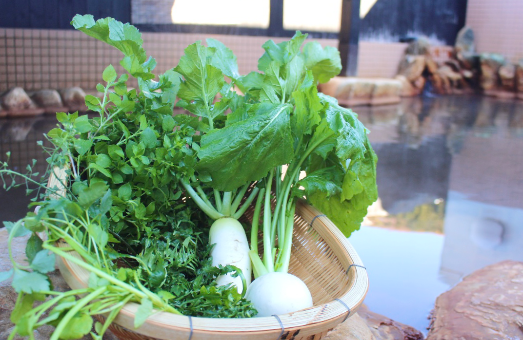 春の七草とは、セリ・ナズナ・ゴギョウ・ハコベラ・ホトケノザ・スズナ・スズシロの7つで、無病息災を祈るものとして、古くから粥に入れて食べられる習慣があります。今回特別メニューとしてご提供する七草粥は白寿の湯おすすめの寝かせ玄米(R)を使用し、真鯛の出汁を合わせた逸品です。七草をお湯に浮かべた七草風呂では、白寿の湯のあたたかな温泉と春の香りに癒されてみてはいかがでしょうか。