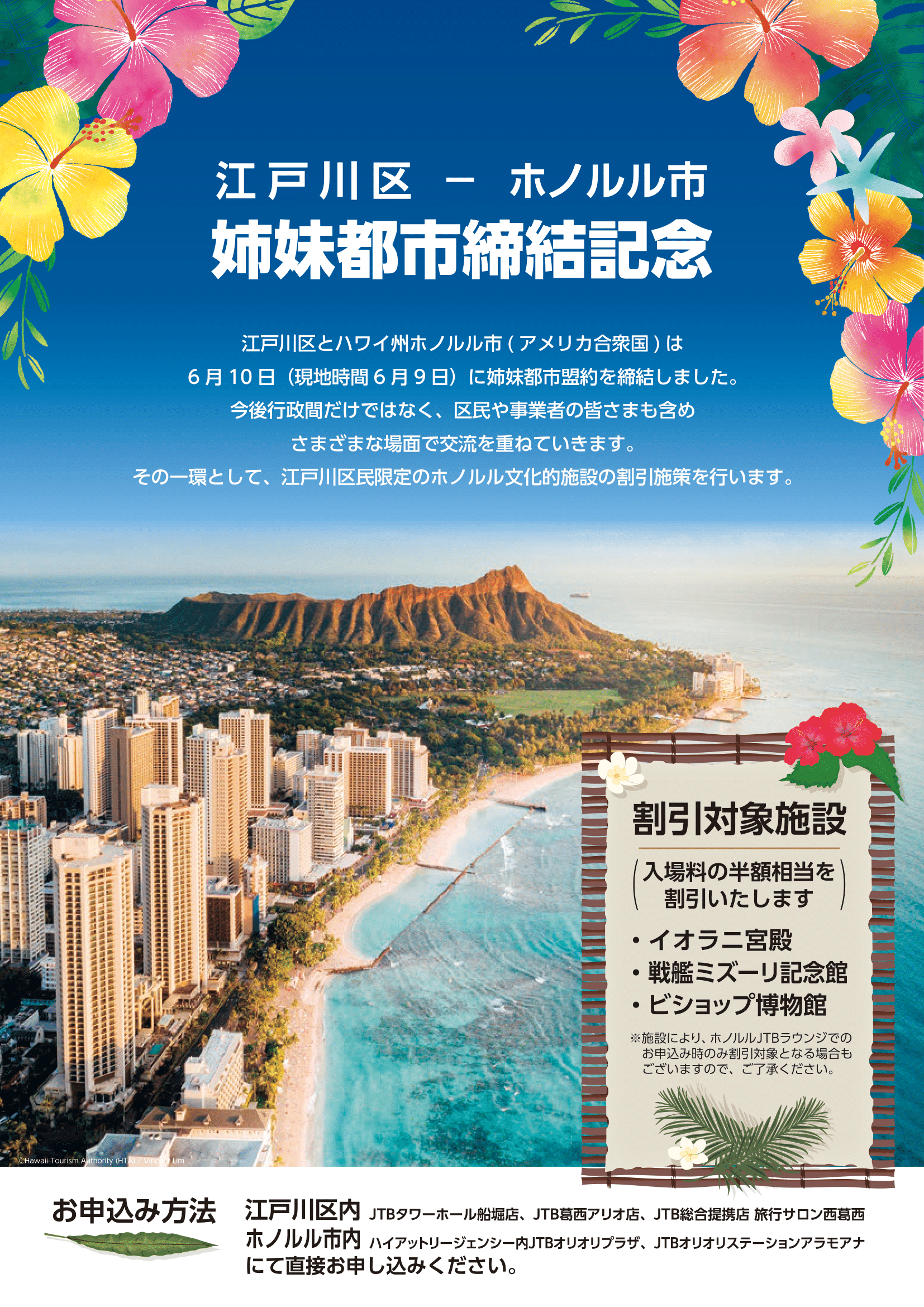 株式会社JTB(以下「JTB」)は、東京都江戸川区(以下「江戸川区」)と連携し、江戸川区とアメリカ合衆国ハワイ州ホノルル市(以下「ホノルル市」)の姉妹都市盟約締結を記念する取り組みとして、江戸川区民が JTB の対象店舗にてホノルル市の文化的施設を訪問するオプショナルツアー及び入館チケット(以下「対象商品」)を購入する際に割引が受けられる事業を、12月1日より開始いたしました。