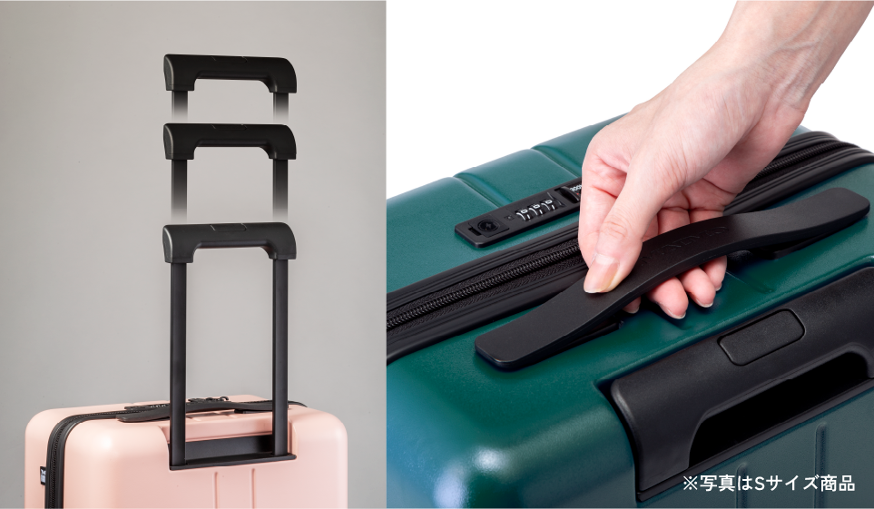 大人も子供も、誰でも使いやすく持ちやすい形状のハンドルを天面と側面に設置し、キャリーバーは身長や使用シーンに応じて使い分けができる3段階調節可能モデルを採用しています。