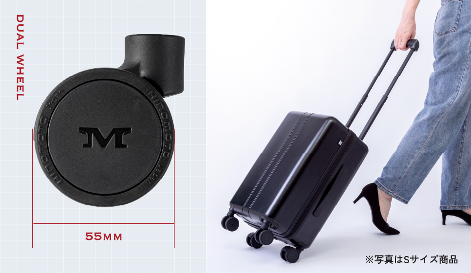 従来のキャスターに比べて走行時の騒音を20デシベルカットした最新タイヤ素材。深夜・早朝も時間を気にせず持ち歩けます。またダブルキャスター搭載により計8輪のタイヤがケースを支えるため、石畳や段差もラクラク走行可能。