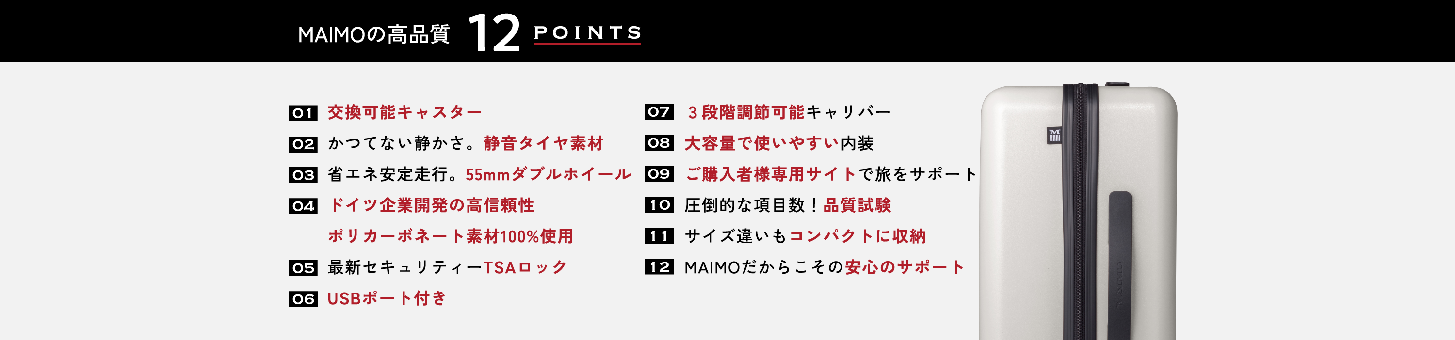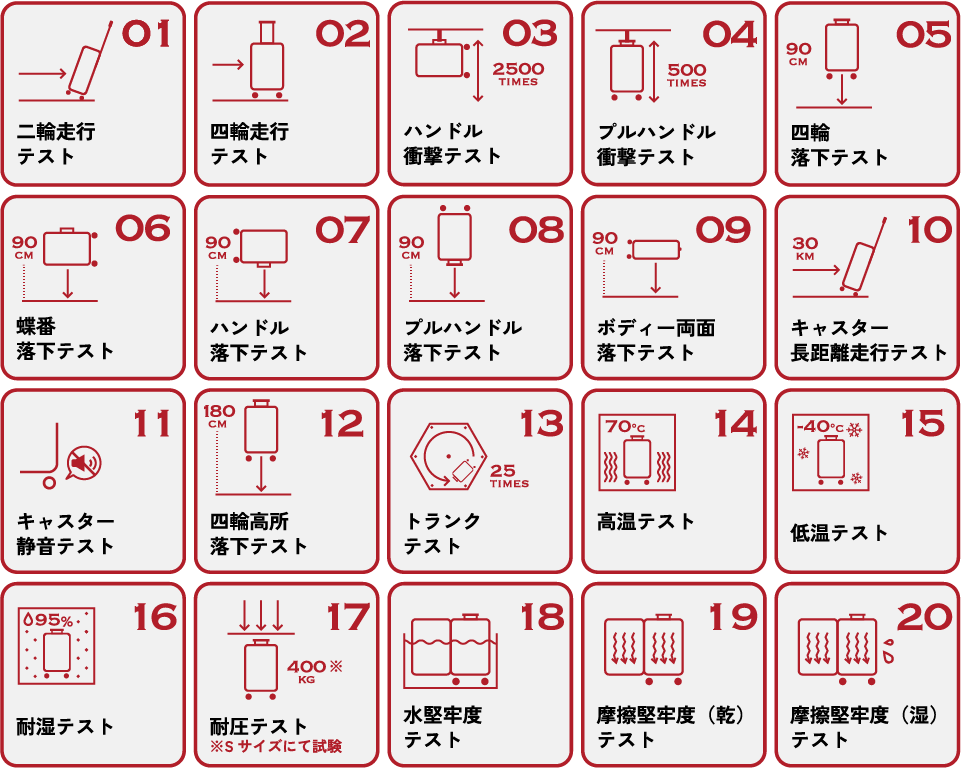 高品質な商品を自信を持ってお届けしたいという思いから、MAIMOはブランド独自の試験基準を設定しています。他社ブランドで通常行われる試験に比べ、2.5倍以上の項目数と厳しい試験基準をクリアした上質なスーツケースをお届けいたします。