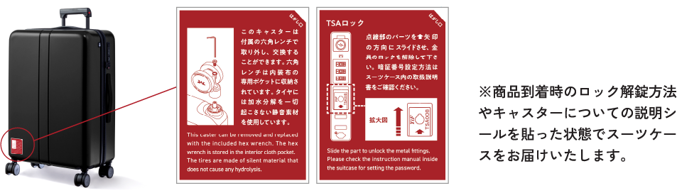 お客様ご自身で取り外し・取り付け可能なHINOMOTO製のキャスターを採用。簡単に取り外せるので日々のお手入れがしやすく衛生的で、故障時に修理へ出す手間もありません。交換用のスペアキャスターも販売しておりますのでぜひお買い求めいただき、MAIMOのスーツケースを長く快適にお使いください。