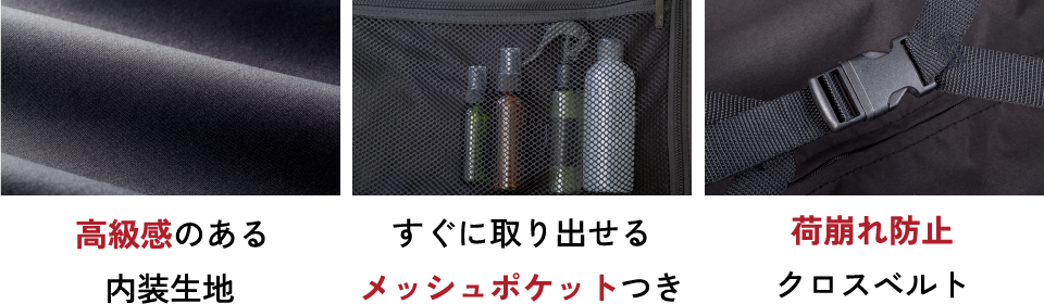 クロスベルト付きの内装仕様で大容量61L(Mサイズ)、92L(Lサイズ))を実現。メッシュポケットはA4サイズ以上の書類や大きなノートパソコンも収納できるよう設計しています。※下記写真はMサイズの商品です。