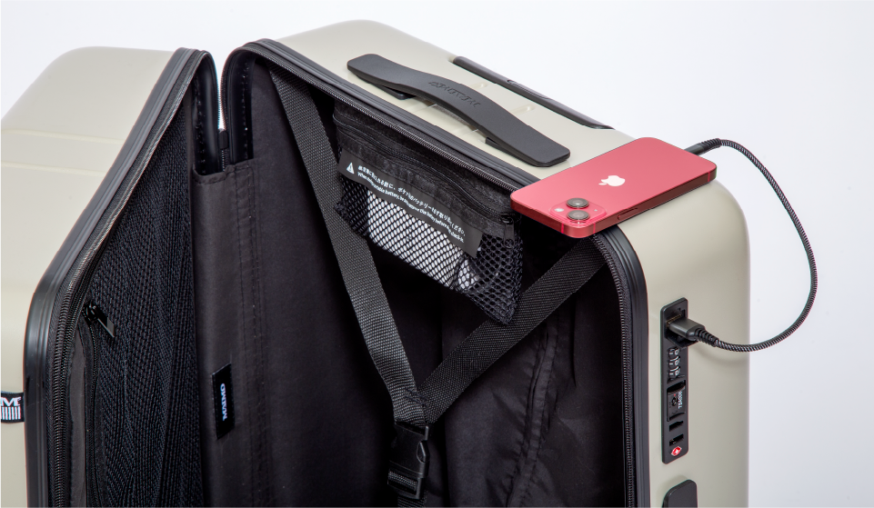 本商品は移動中に重いモバイルバッテリーを持ち歩かず、お客様ご自身のモバイルバッテリーを収納して内蔵コードと接続することによりスーツケース側面から電源を取れる仕様です。内装にはモバイルバッテリー収納ポケットもついています。