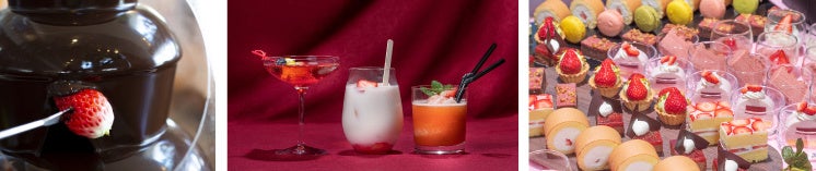 とろりと流れるなめらかなチョコレートに甘酸っぱい苺やフワフワのマシュマロをくぐらせる「チョコレートファウンテン」は見ているだけでもうっとり。「苺のモクテル」は、苺とノンアルコールスパークリングワインで作ったレオナルド、苺と牛乳を合わせた苺みるく、苺シロップとオレンジジュースをフローズン状にしたストロベリーパンチの3種類をご用意。その他、苺尽くしのスウィーツを心ゆくまでお愉しみください。