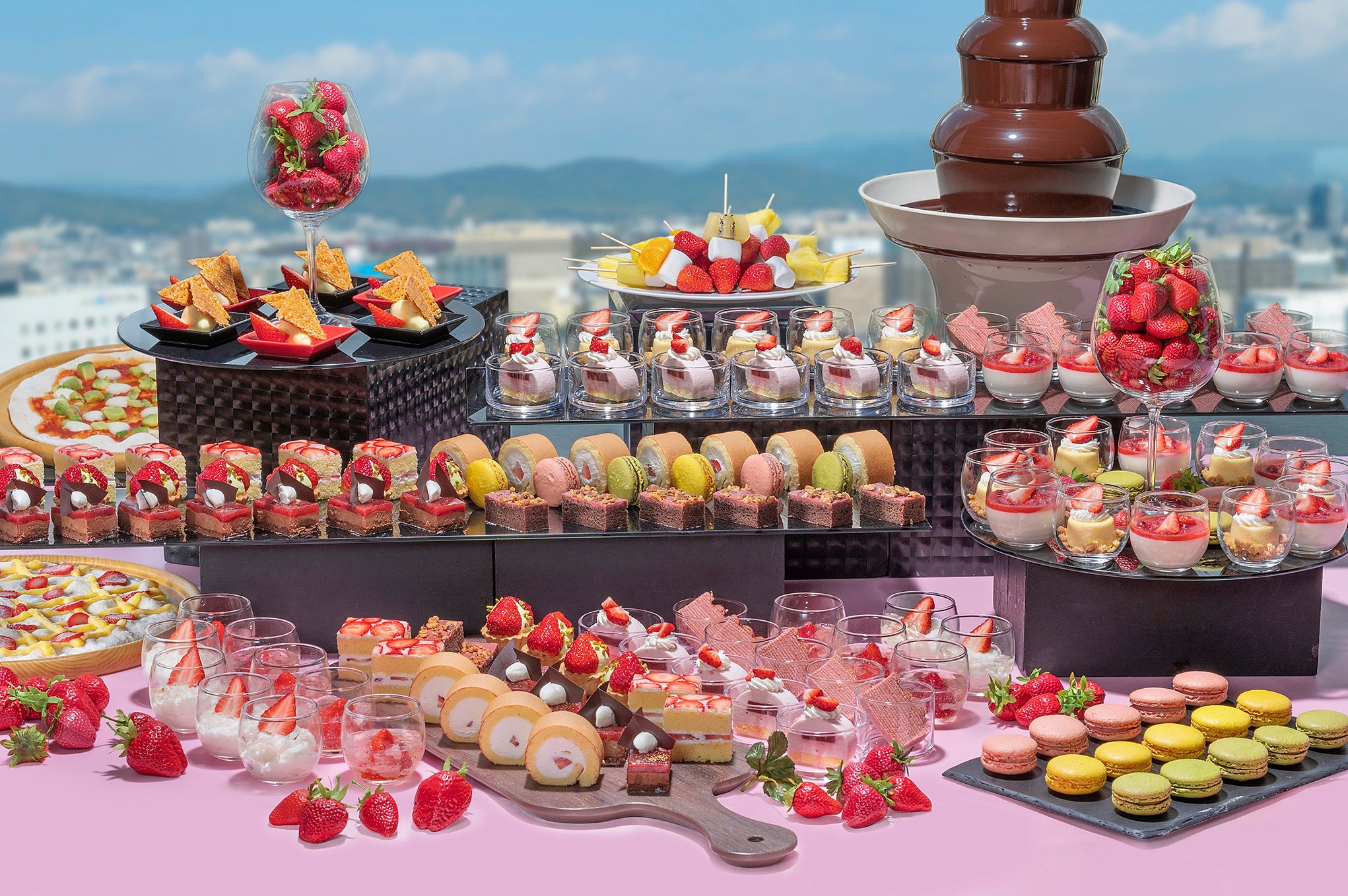 大きな窓から光が降り注ぐ明るい店内で、苺のロールケーキや苺のショートケーキ、苺とピスタチオのタルトや苺とくるみのブラウニーなど、苺尽くしの目にも鮮やかなスウィーツをはじめ、目の前で搾りたてをご提供する“生搾りモンブラン”や苺などのフルーツで作るフルーツフランべなど、お好きな苺スウィーツを時間いっぱいお腹いっぱいお愉しみいただけます。また、バーテンダーが考案した「苺のモクテル」3種類も登場。ライトミールでは、苺のピッツァやパスタ、自分で具材を選んで作るサンドウィッチなども充実。もちろんフレッシュ苺も食べ放題。“苺尽くし”な心ときめくスウィートな時間を心ゆくまでご堪能ください。