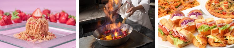 ライブキッチンでは、フレッシュ苺や苺の生クリーム、メレンゲの上から1mmの極細クリームを目の前でたっぷりと搾る「生搾りモンブラン」が新登場。またシェフが目の前で繰り広げる迫力満点の炎の演出と甘い香りに誘われて思わず笑顔になる「フルーツフランベ」。お好みの具材を選びながら自分で作るオリジナルサンドウィッチはスウィーツの合間にお愉しみいただけます。