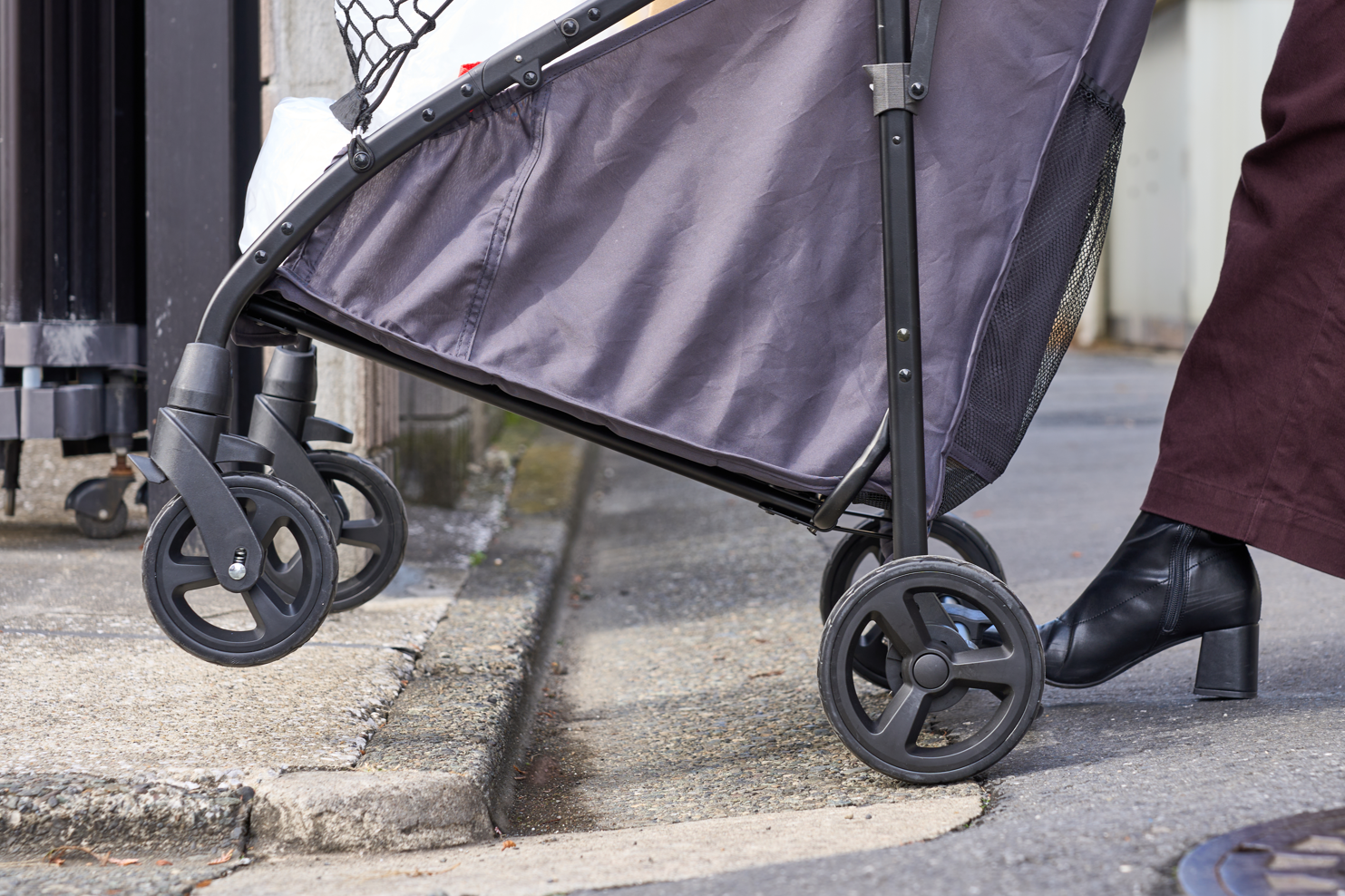 後ろに傾斜した形状で段差や下り坂でも荷崩れしにくく、「足元バー」で段差や坂道もラクラクです。