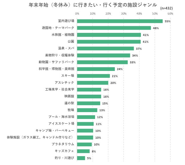昨年は「温泉・スパ」が最も多く、次に「遊園地・テーマパーク」となっており、今年最も多かった「室内あそび場」は昨年は6位、割合も21%と今年の半分以下という結果でした。