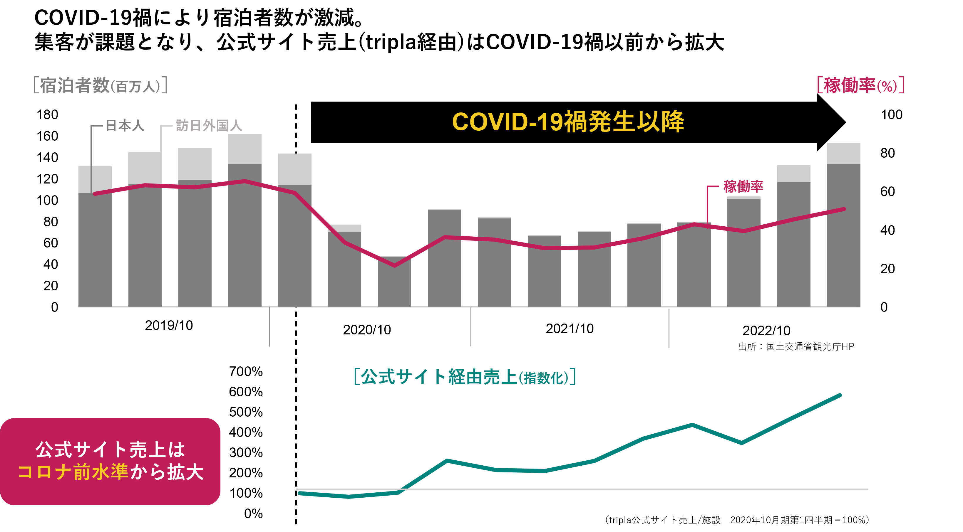 コロナ禍の影響を受け宿泊者数が激減した宿泊業界ですが、自社公式サイト経由の売上はコロナ禍以前に比べ増加傾向にあり、コロナ禍を経て、自社予約比率向上の重要性が問われています。