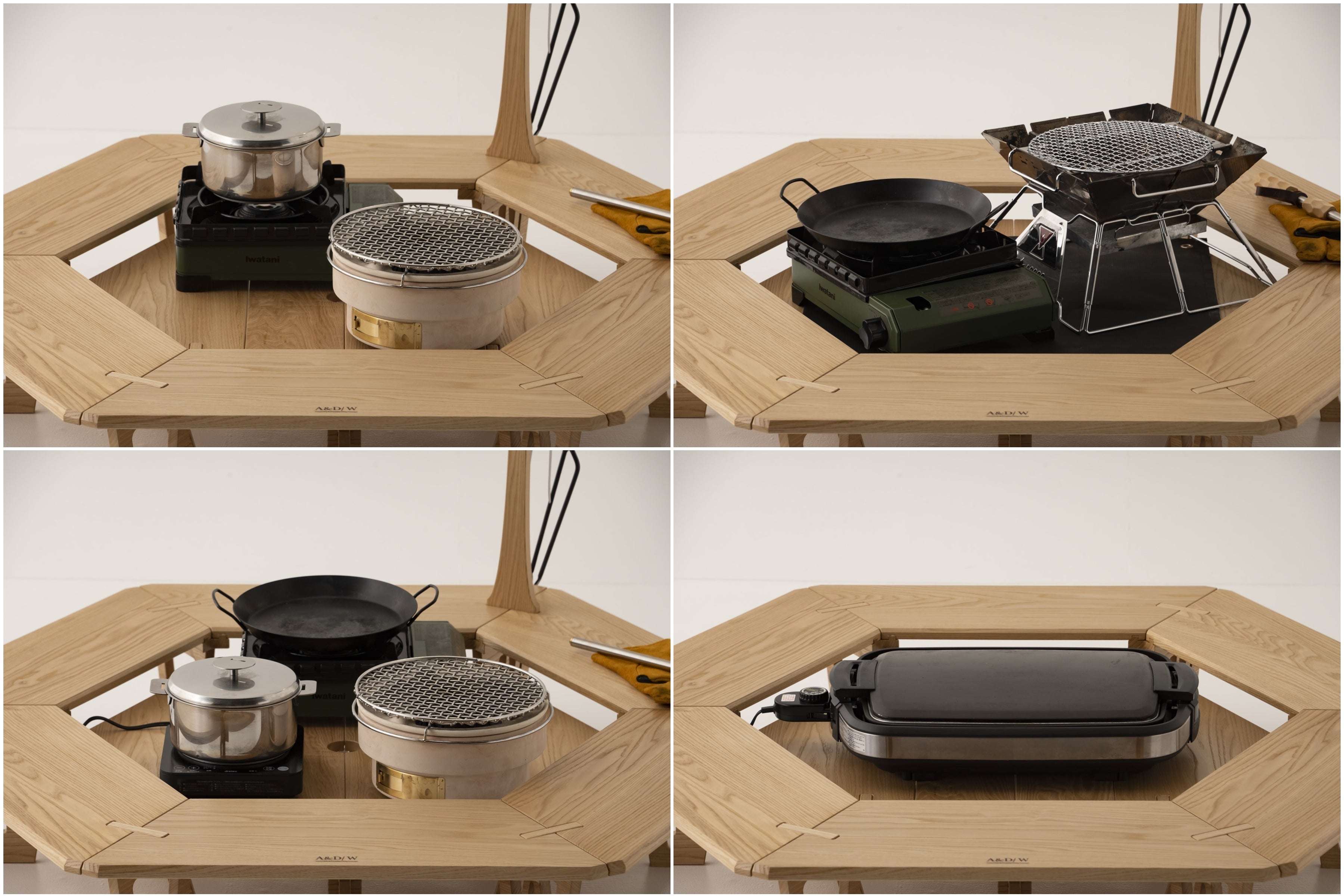 中央の六⾓蓋⾯積が⼗分に広いため、七輪や焼⾁グリル、カセットコンロや卓上IH等を同時に設置でき、「お⾁の種類によって炭⽕と鉄板を使い分けたい」「お⾁も焼きたいし、同時に煮炊きもしたい」、「料理ごとに熱源を変えたい」といったご要望にお応えしています。3つの熱源「炭」「ガス」「電気」を同時に使うことが可能な囲炉裏テーブルです。