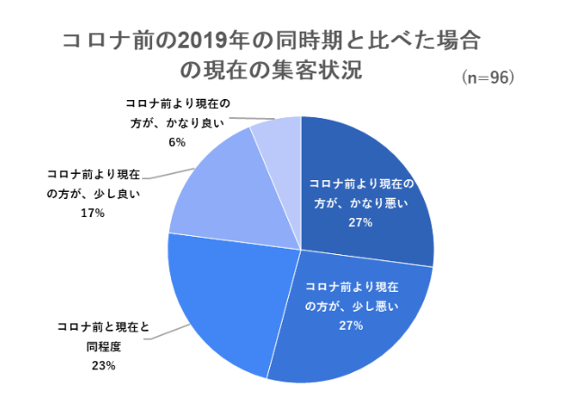こちらでも、「かなり悪い」と「少し悪い」の合計が54%と半数以上となっており、現在でも集客状況が戻ってきていない状況となっています。