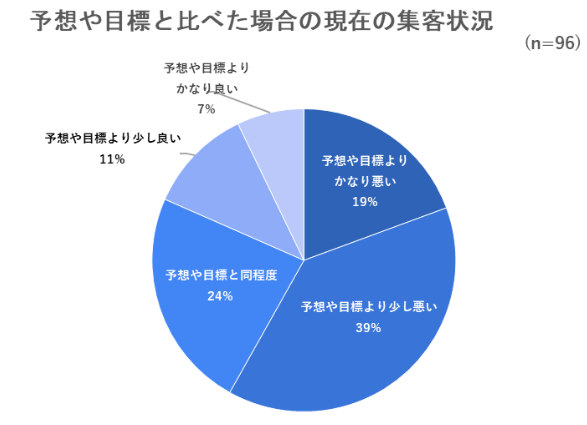「予想や目標よりもかなり悪い」が19%、「少し悪い」が39%と合わせて約6割が当初の予想や目標よりも悪いと回答しており、当初の予想以上に集客が悪い状況であることが見受けられます。