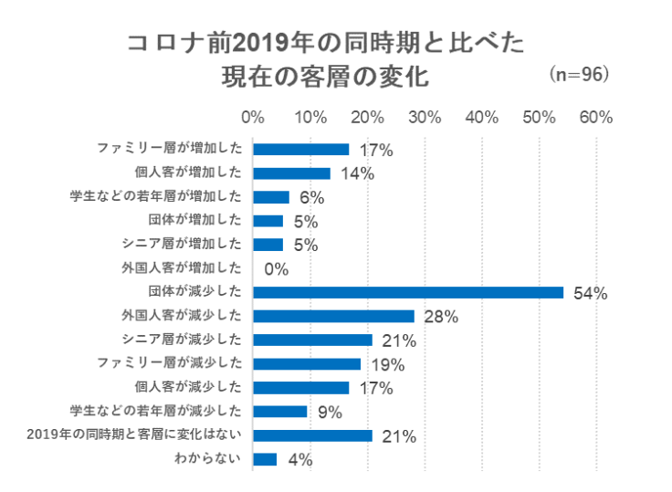 グラフのとおり、どの客層に関しても、増加したという割合よりも減少したという割合の方が多く、特に「団体」が減少したまま回復していないことがわかります。