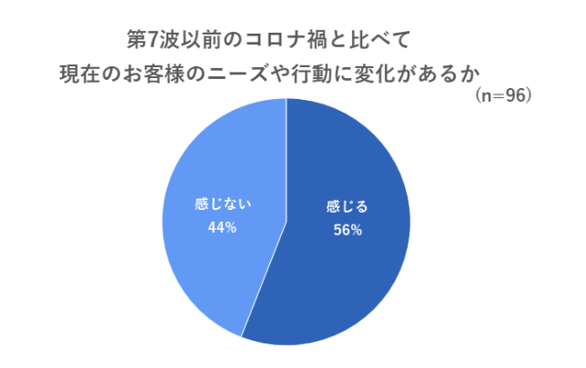 第7波以前のコロナ禍と比べて現在のお客様のニーズや行動に違いを「感じる」という施設が56%と6割近くになりました。