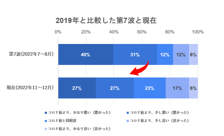 次に、現在の2022年11月~12月の集客状況をコロナ前の2019年の同時期と比べて聞いた結果です。