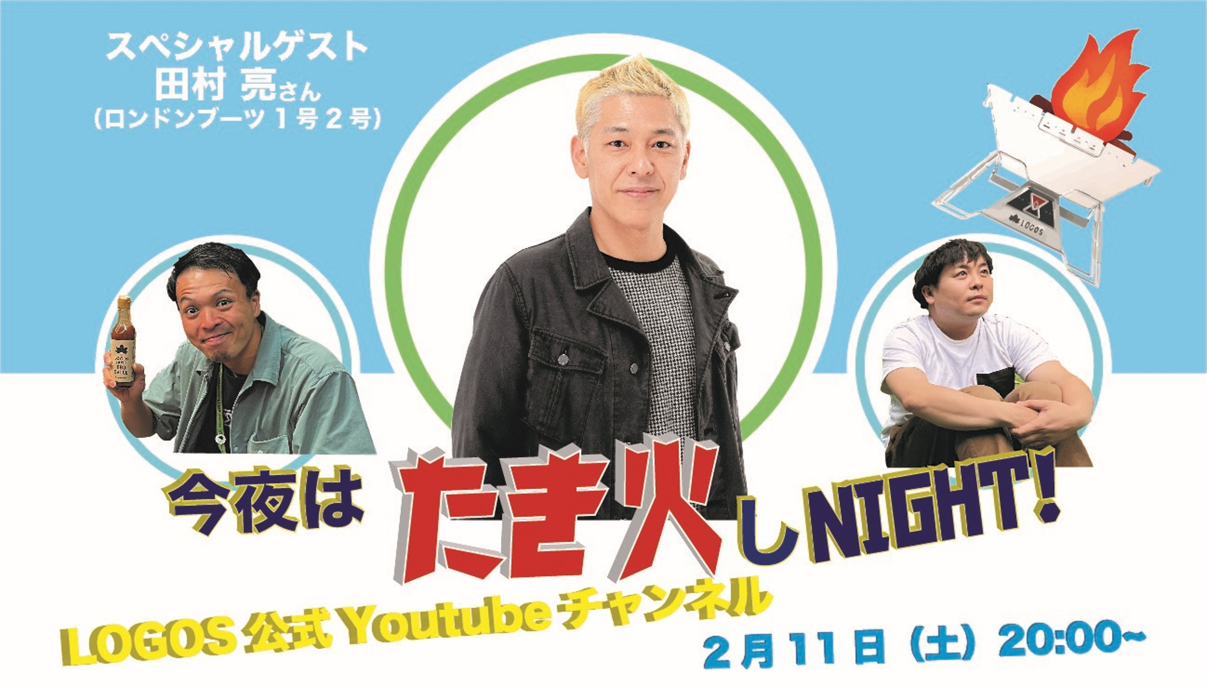 LOGOS公式YouTubeチャンネルにて毎月配信しているたき火LIVE配信「今夜はたき火しNIGHT!」の特別版として、ロンドンブーツ1号2号の田村亮さんをゲストに迎え、宿泊者様を対象にトークショーを実施します。
