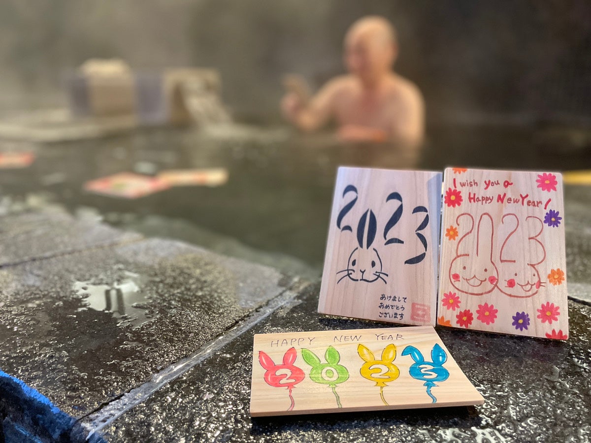 株式会社温泉道場(埼玉県比企郡ときがわ町、代表取締役 山崎寿樹)は、お正月のお風呂イベントとして「100の年賀状風呂」を今年も開催いたします。スタッフからお客様へ、新年のご挨拶をしたためたヒノキの年賀状100枚が男女露天風呂に浮かびます。