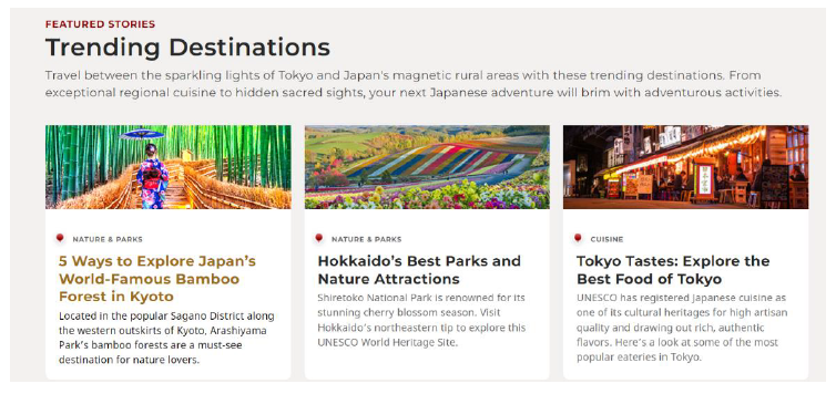 「MarCoPay」内に、JALオリジナルの日本各地の観光スポット、体験できるアクティビティー、食事などさまざまな情報を外国人向けに発信している情報特設ページ「Guide to Japan」のURLを設定します。発信内容は常時更新しているため、最新の観光情報をもとに、旅行先を検討いただけます。
