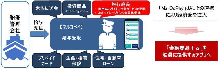 日本航空株式会社(本社:東京都品川区、代表取締役社長:赤坂祐二、以下JAL)と日本郵船株式会社(本社:東京都千代田区、代表取締役社長:長澤仁志、以下、「日本郵船」)のグループ会社で船員向け電子通貨プラットフォーム事業「MarCoPay(マルコペイ)」を運営するMarCoPay Inc.(本社:フィリピン・マニラ 代表取締役社長:藤岡敏晃、以下「マルコペイ社」)は業務提携契約を締結し、「MarCoPay」のモバイルアプリ上で、フィリピン人船員とその家族の福利厚生の充実と、新たな訪日需要の創出による地域活性化への貢献を目的としたサービスを12月23日より開始します。