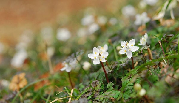 林下に生育する高さ4~15cmの多年草です。当園では、早春に最も早く開花する花で、梅に似た花と、端正な五角形の葉が特徴です。 “オウレン”とは、中国からわたってきた漢方薬の黄蓮のことで地中を這う地下茎が黄色く、よく似ていることから、梅花黄連(バイカオウレン)と名がついています。植物学者・牧野富太郎博士が愛した花としても知られています。