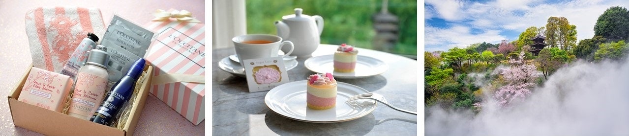 新しい春を迎える方へエールを贈る、ロクシタンの桜の香り「チェリーブロッサム」のボディケアアイテムを含むギフトセットや、お部屋でお召し上がりいただく、桜クリームの季節限定ケーキがついた、春におすすめのステイプランです。