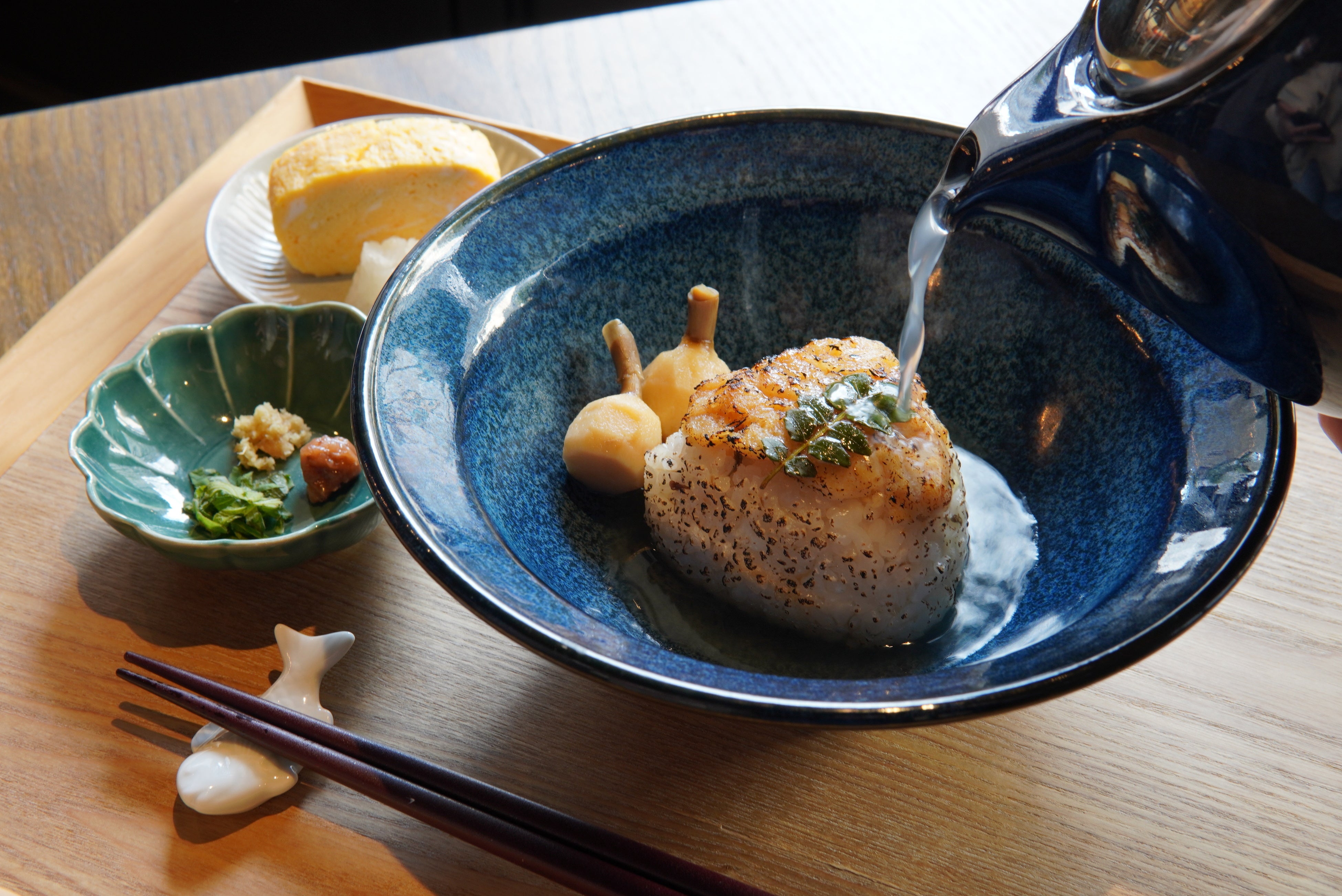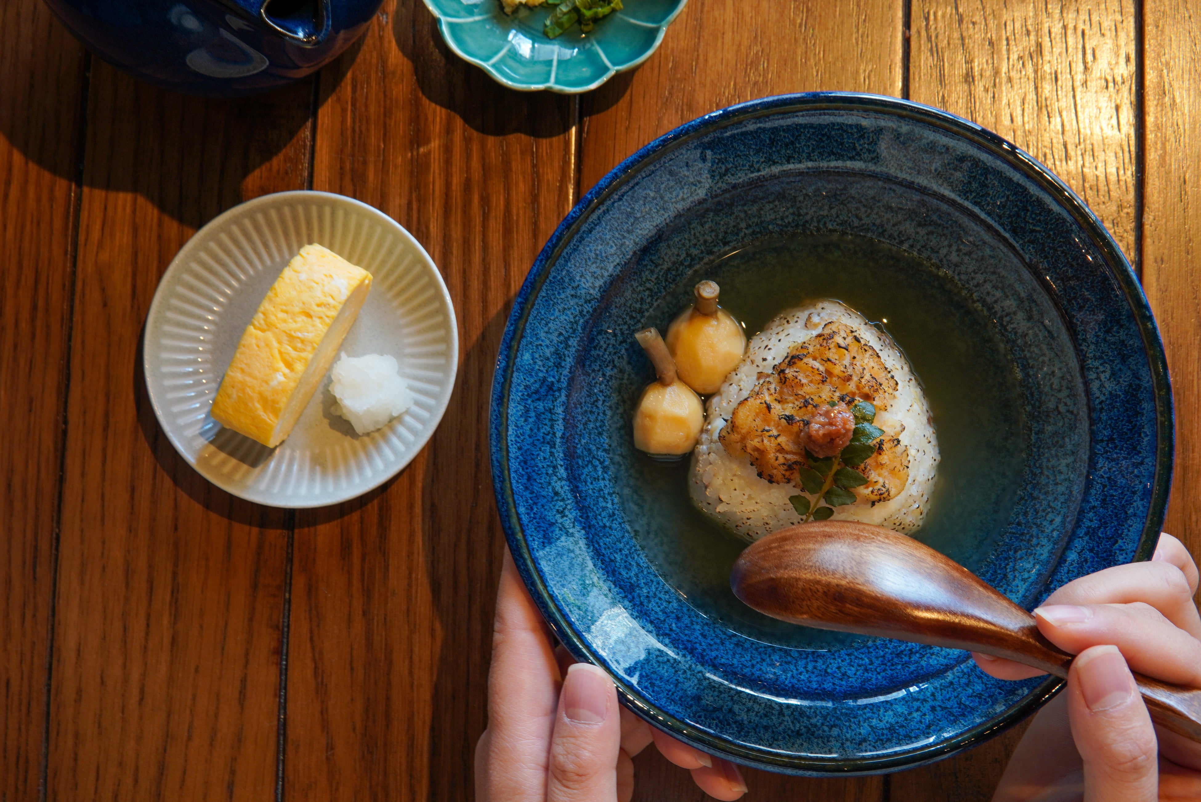 【炙り鯛づくし茶漬け】に使用した鯛は、鞆の浦で漁師・魚屋を営む岡崎丸から直接仕入れます。鯛の身は焼いたものをほぐして 無添加味噌と合わせて自家製鯛味噌に仕上げ、はっとり生姜(福山市駅家町産)と一緒に炊いたお米(府中市木野山町産)にたっぷりとのせ、最後に軽く炙ります。お茶漬けの出汁には身を取った鯛のアラを使用。アラは、煮込む前に焼くことで臭みがなくなり、香ばしさが加わります。さらに汁腕の中には福山が生産量一位を誇る縁起物の地元産クワイの煮物を添え、別皿にはだし巻き卵(玉子は世羅町産)と薬味をご用意しました。これにより、味に変化が加わり最後までお茶漬けをお楽しみいただけます。年末年始で酷使した胃が喜ぶような、鯛味噌と出汁の上品な鯛の風味は、冬の朝、起き抜けの体にやさしく染み渡ります。