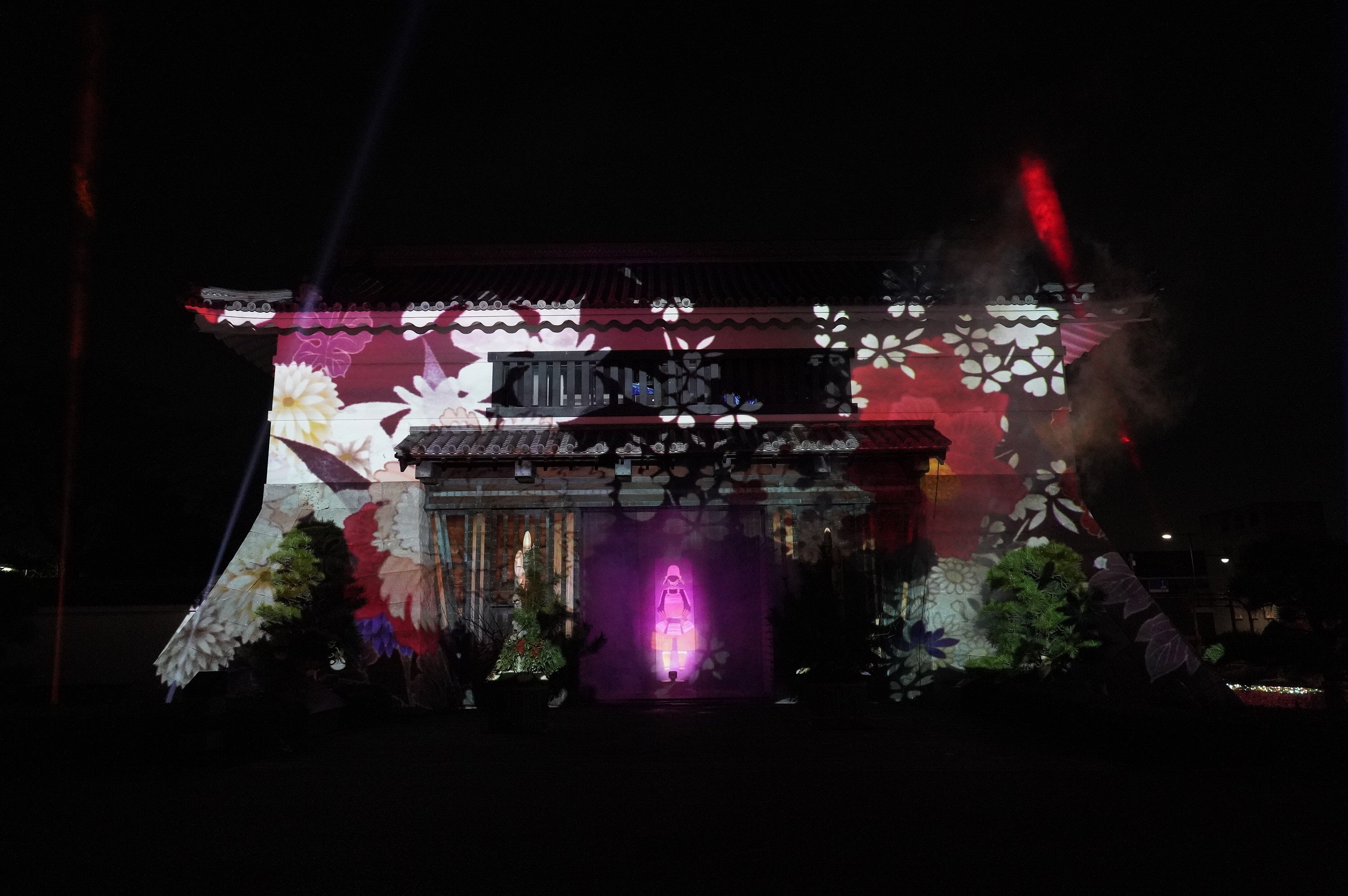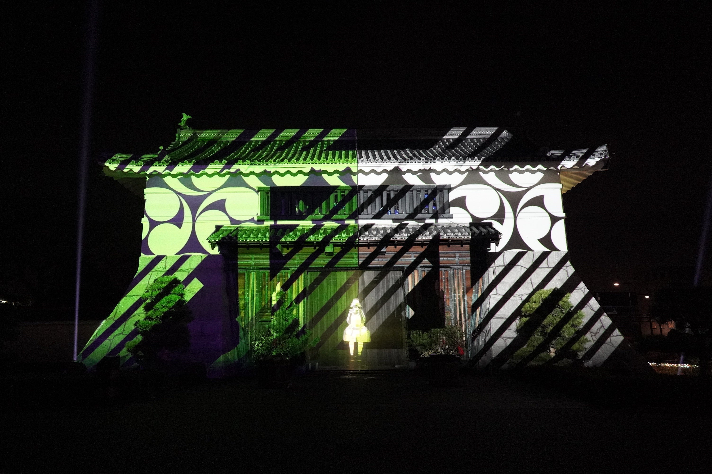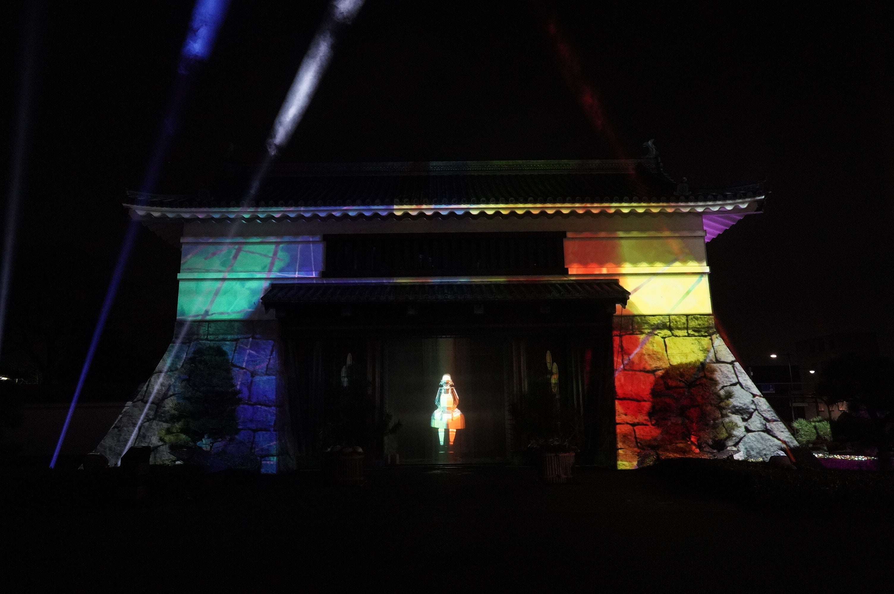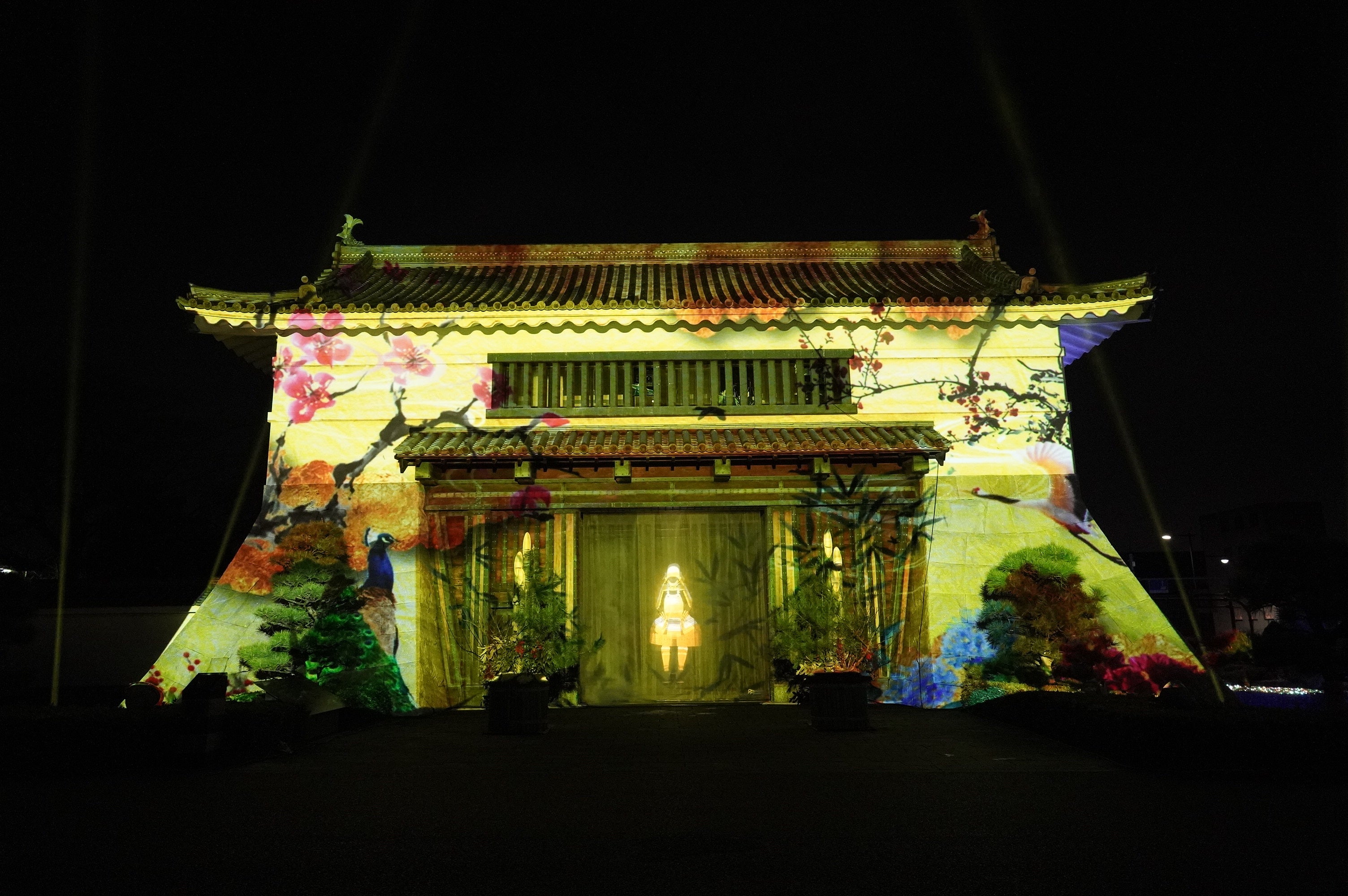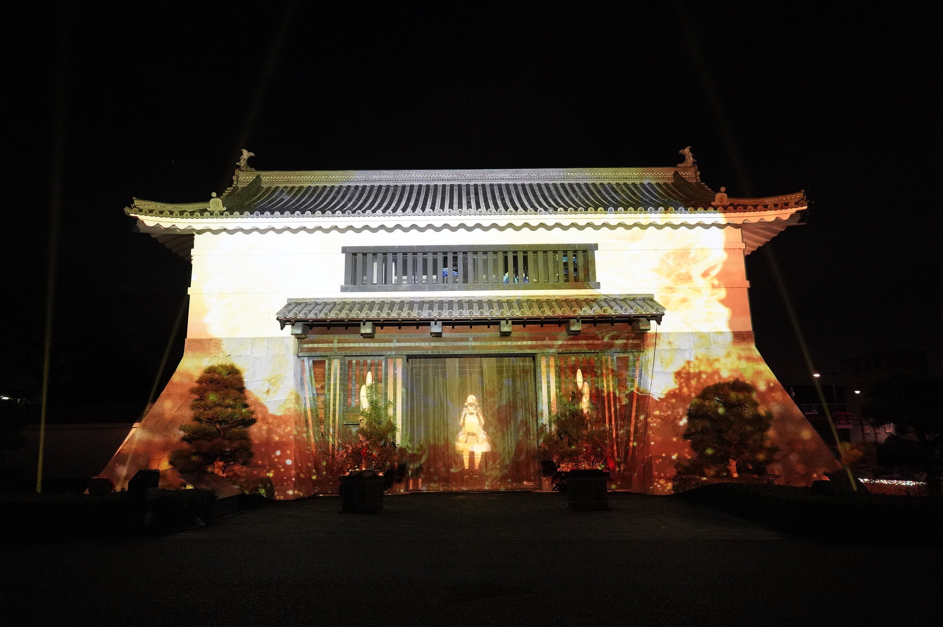 【内容】 徳川家康生誕の地・岡崎城の表玄関で幅16.4メートル・高さ11メートルの大手門に、岡崎市が誇る文化財などをモチーフとしたプロジェクションマッピング映像を投影します。また「岡崎城大手門 デジタルペインティング募集」の応募作品の中から選出された作品をインターミッションコンテンツとして投影します。