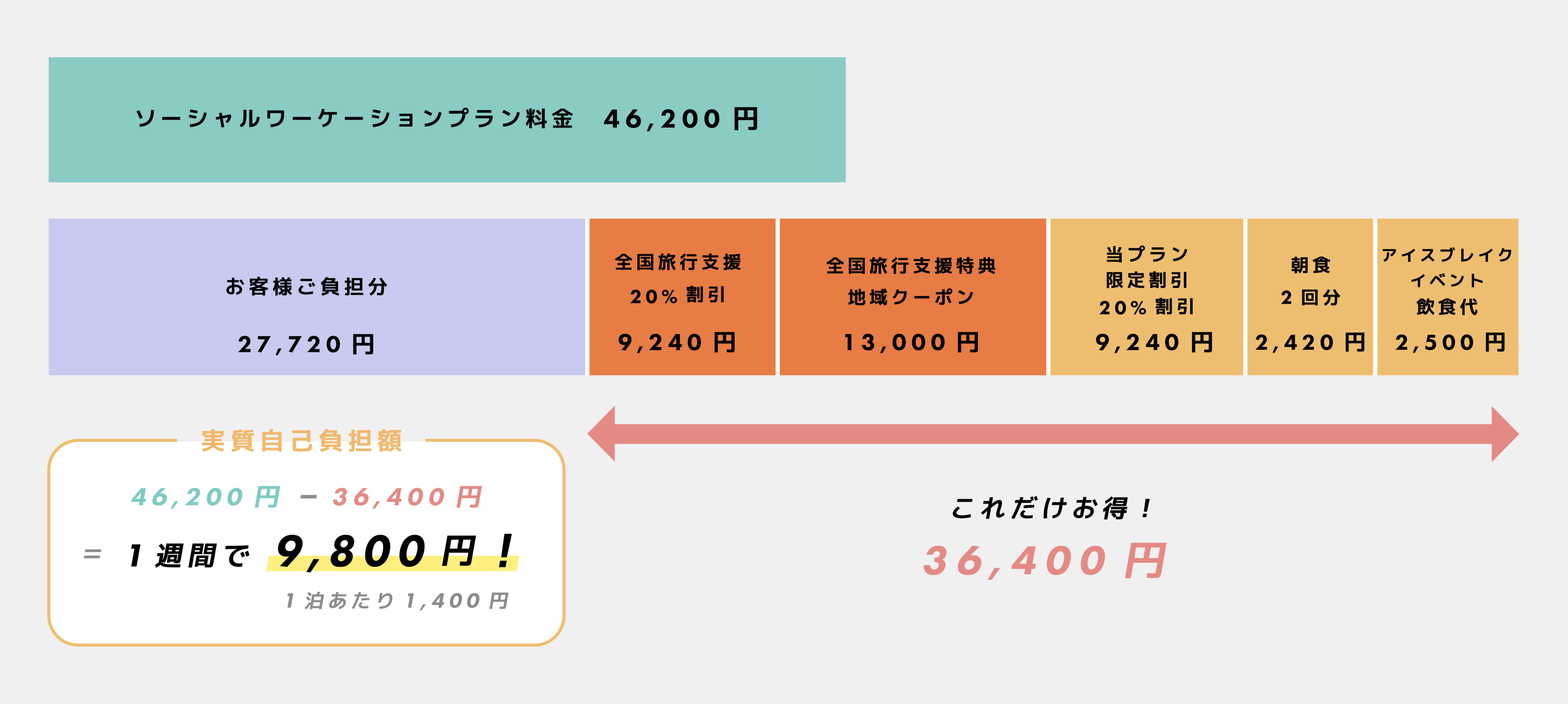 この度、来年2023年1月10日(火)以降も全国旅行支援を実施することが発表されましたが、割引率が従来の40%から20%に、また地域クーポン付与額も引き下がることになりました。そこで、ESTNATE HOTEL 那覇では、引き続き多くの皆様にソーシャルワーケーションプランをお得に楽しんでいただくために、全国旅行支援の20%割引に加えて、追加で独自に20%割引したプランをご提供いたします。チェックイン当日の参加者とのアイスブレイクイベント時の飲食代、また、お好きな日に利用可能な朝食2回分も含まれる充実の内容で、7泊8日の滞在が実質自己負担9,800円(税込)、1泊あたり1,400円(税込)と大変お得なプランとなっております。この機会に全国旅行支援を活用して、沖縄で仕事も遊びも充実の“交流のある”ワーケーション「ソーシャルワーケーション」をお得に体験しませんか?