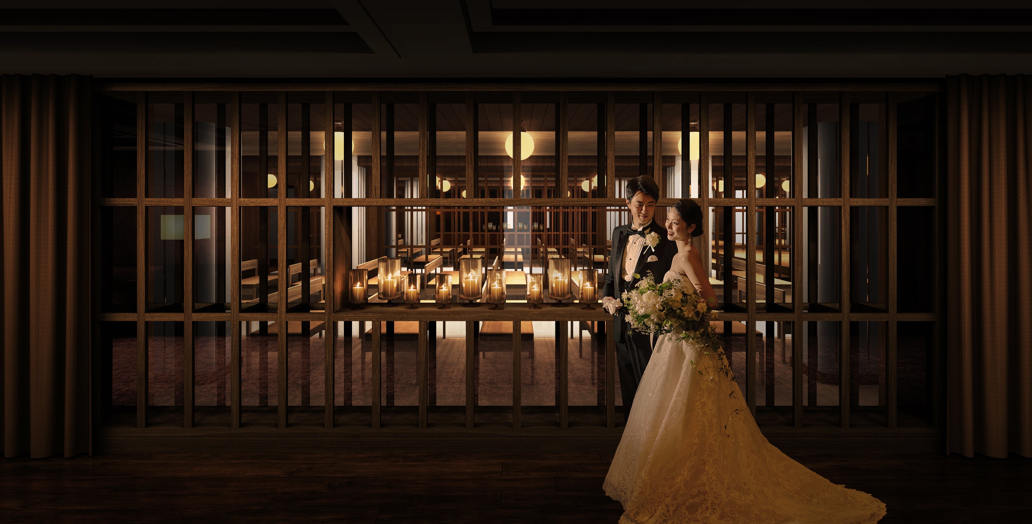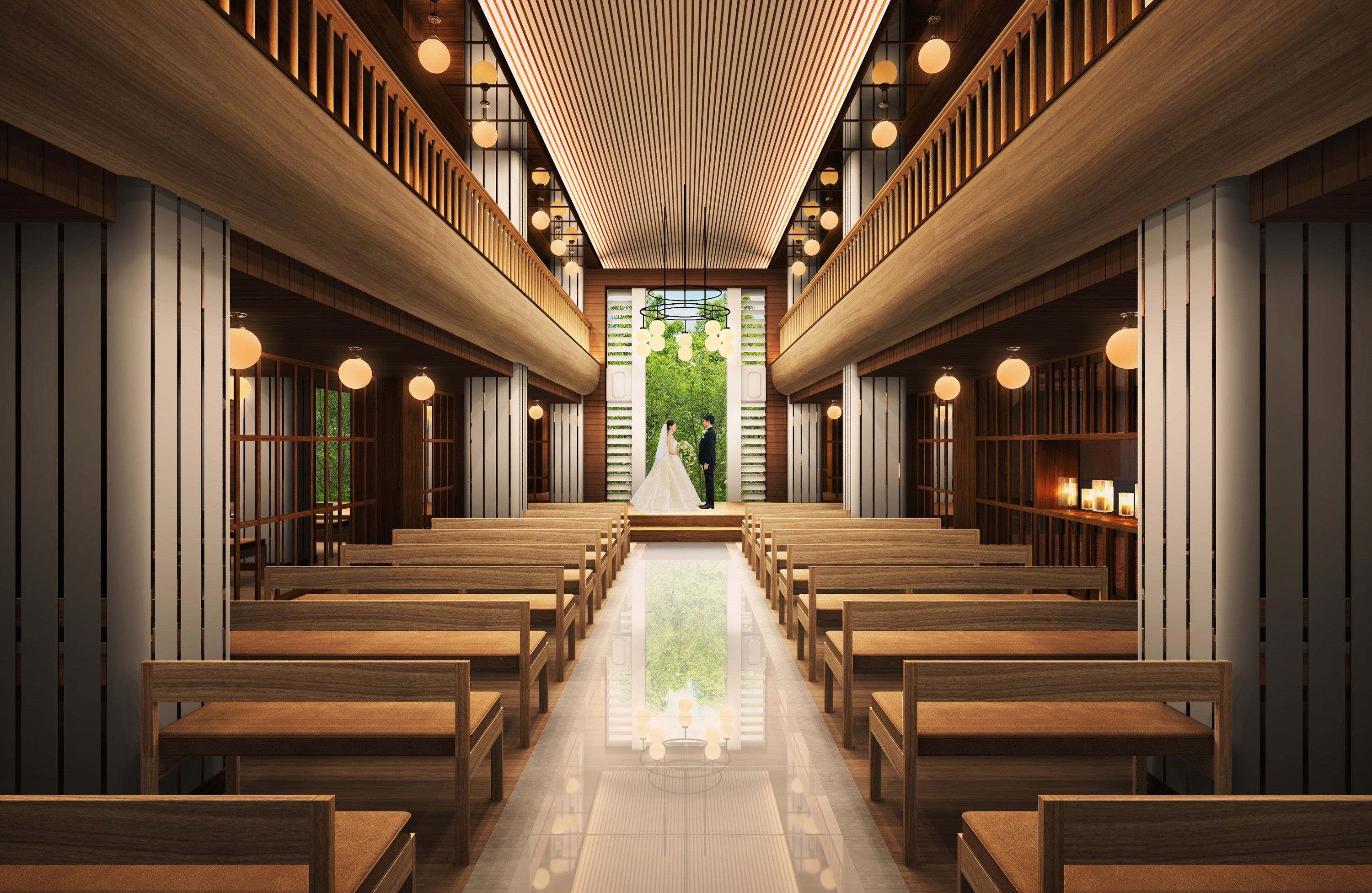 照度にもこだわり斬新な空間を演出しながら、木の温かみや、暖炉を思わせるような柔らかさも兼ね備え、大人のウエディングを引き立てるハイエンドなチャペルへと生まれ変わります。上質な雰囲気は、フォトスポットとしても印象に残ります。