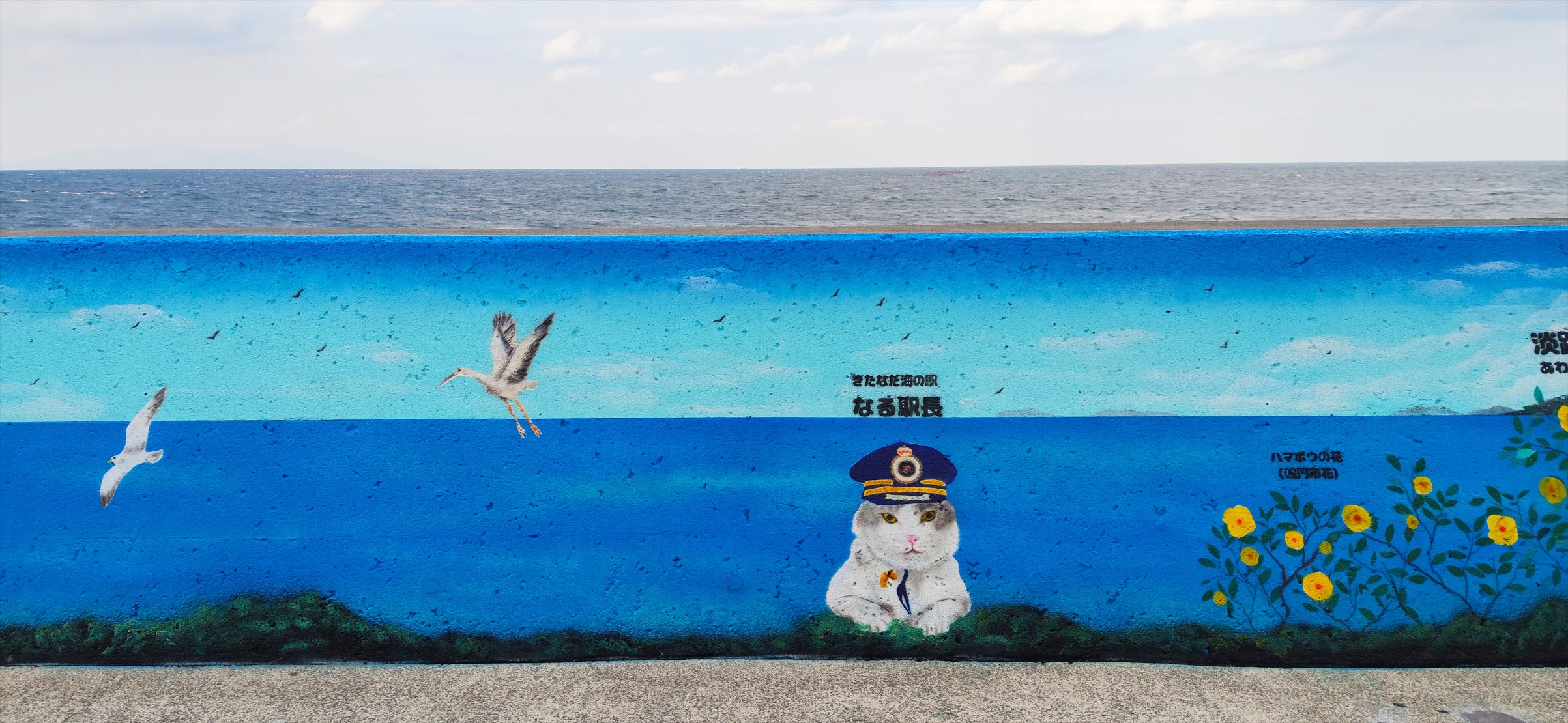 ホテルから車で20分、鳴門市北灘町「きたなだ海の駅」の防波堤にスプレーアートが登場!海の駅の看板猫“なる駅長”がほっこりアートでお出迎え。