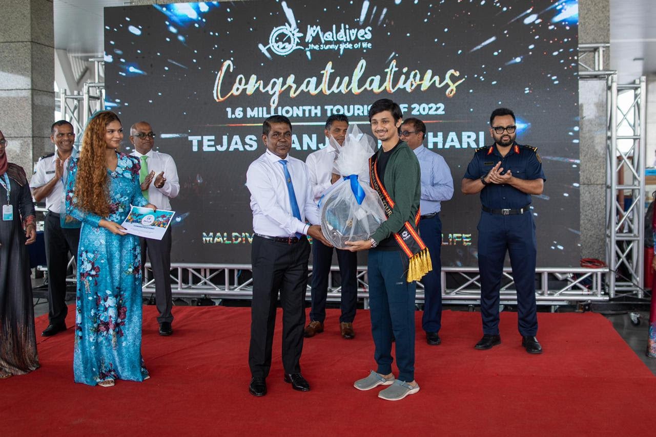 160万人目の訪問者となったインド出身のTejas Sanjay Kothariさんが、ハネムーンのためにエア・ビスタラ機(UK271)でモルディブに到着。Tejas Sanjayさんに特別なギフトが授与された。今回が初めてのモルディブ滞在で、配偶者も同伴していた。160万人目の来場者を迎え、モルディブの伝統的なボドゥベル演奏とパレードでイベントエリアまでエスコートし、モルディブの伝統的なダンスが披露された。その後、MMPRC、MACL、観光省、モルディブ入国管理局、モルディブ税関からの特別なプレゼントであるモルディブの伝統的なTannuが副大統領から授与された。LUX南アリ環礁の無料バウチャーも贈呈された。