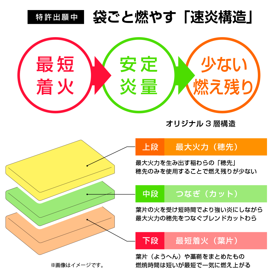 ・袋詰めした三層の藁が毎回決まった順に燃えることで安定的に燃やせます。