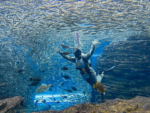 「うみがたり大水槽」の生きものたちに、お年玉としてエサをプレゼントします!プレゼントを渡すのは、令和5年の干支である卯(ウサギ)ダイバー!