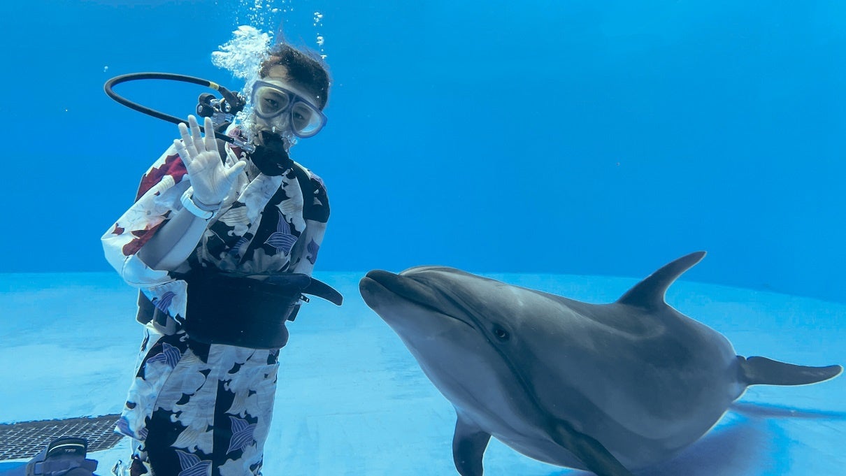 冬期限定水中ドルフィンパフォーマンス「Art of Dolphin」は、イルカとお正月らしく着物風衣装に身を包んだトレーナーが水中でパフォーマンスを繰り 広げます。バンドウイルカの美しさや力強さを間近に感じる ことができるだけでなく、浮遊感やプールに降り注ぐ自然光など、空間そのものもお楽しみいただけます。