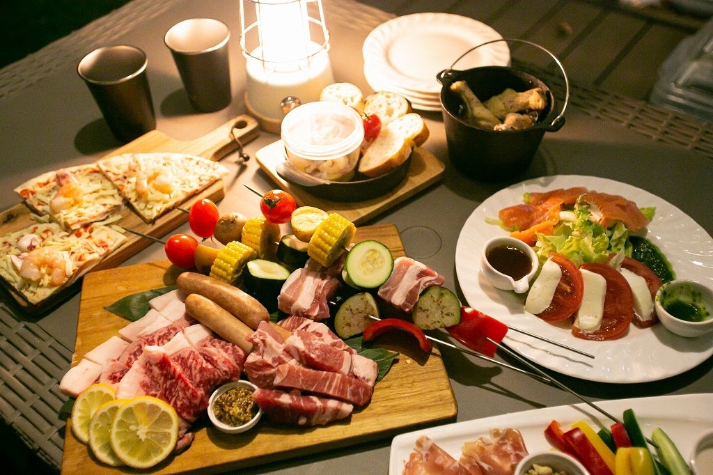 【glampark ヘルシーパル赤城の魅力②.地元群馬県産を楽しめるバーベキュープランと会席料理】