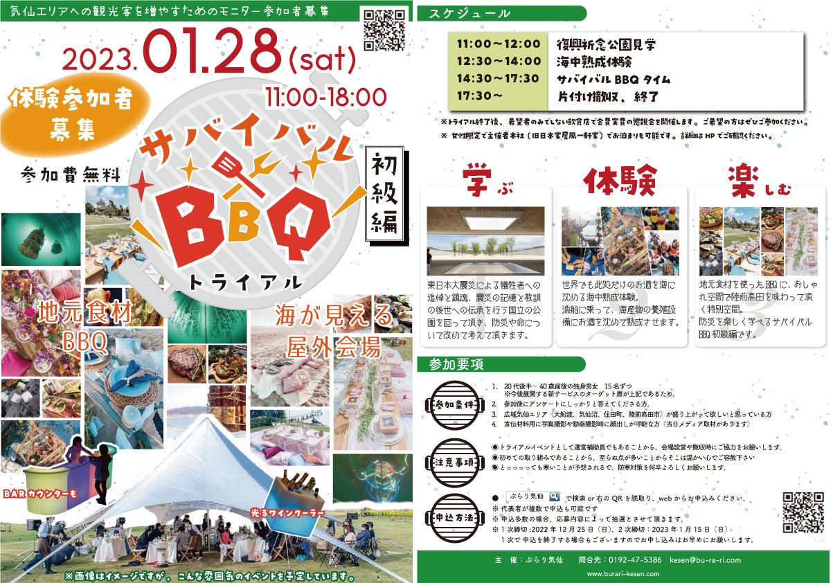 合同会社ぶらり気仙(岩手県陸前高田市:代表社員 鍛治川直広)は、1/28(土)陸前高田市にて、新たな観光コンテンツのトライアルとして 、(1)震災復興祈念公園で防災や命の大切さを学び、(2)お酒を海に沈める海中熟成体験を通じて、三陸沖広田湾の海産物を楽しく知り、 (3)海が見える会場で、簡単な防災を学びながら、三陸沖広田湾産海産物を使ったBBQと地元のお酒を楽しむサバイバルBBQを開催します。