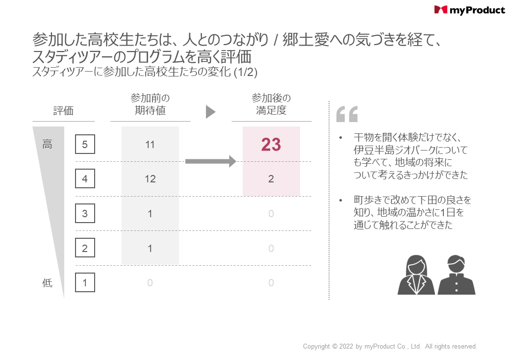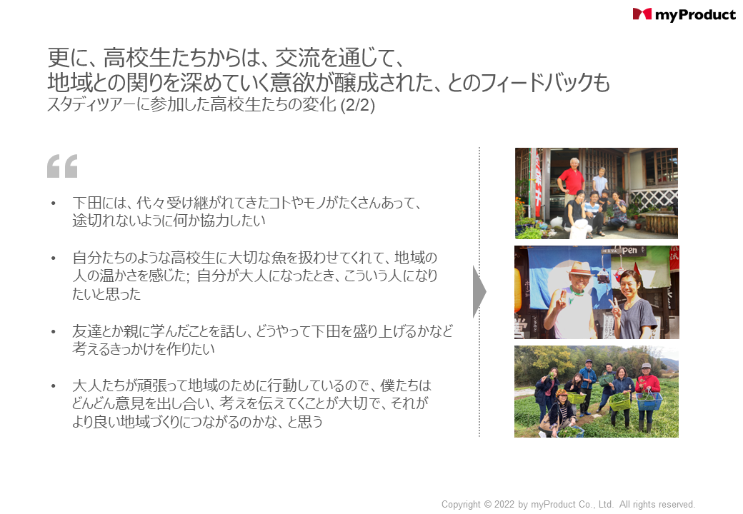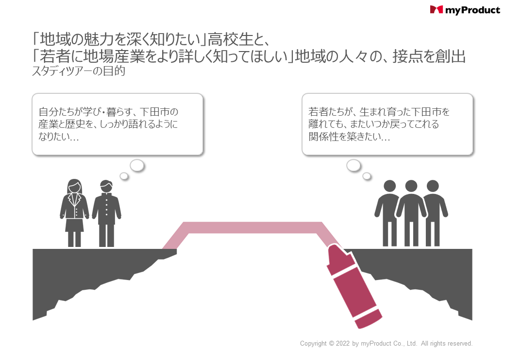 下田高校とは、マイプロダクトの地域共創事業を取り上げた「ガイアの夜明け (テレビ東京)」の放映をきっかけに、連携をスタートさせました。生徒たちの出身地である下田市の、文化と魅力が十分に知られていない、という課題意識に対して、この度のスタディツアーを共同企画しました。なお、本ツアーを経て、地域への理解が深まることで愛着も育まれることが、効果として確認されています。