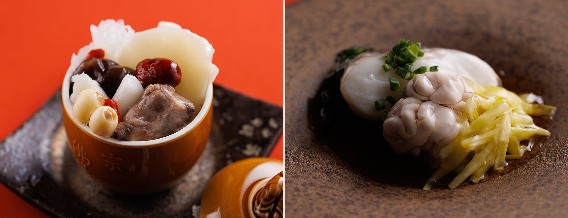 牛テールと、中国漢方に由来するクコの実・蓮の実・なつめ・准山・干し椎茸、白きくらげやフカヒレなどを蒸し上げた壺蒸しスープです。