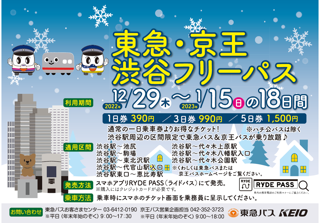 東急バス株式会社(本社:東京都目黒区 社長:古川 卓)と京王バス株式会社(本社:東京都府中市 社長:宮坂 周治)は、2022年12月29日(木)~2023年1月15日(日)18日間の期間限定で、渋谷駅周辺の東急バスおよび京王バスの路線がどちらも乗り放題で利用できるお得な企画乗車券「東急・京王 渋谷フリーパス」を発売いたします。この乗車券は本年シルバーウィーク期間に発売した「東急・京王 渋谷バスさんぽチケット」(実施期間9日間)に引き続き、利用範囲はそのままに利用期間を大幅に拡大してリニューアルするもので、観光目的のみならず平日のちょっとしたお出かけやビジネスユースでも利用しやすいよう、新たに5日券を設定し、このエリアの気軽な移動をサポートいたします。