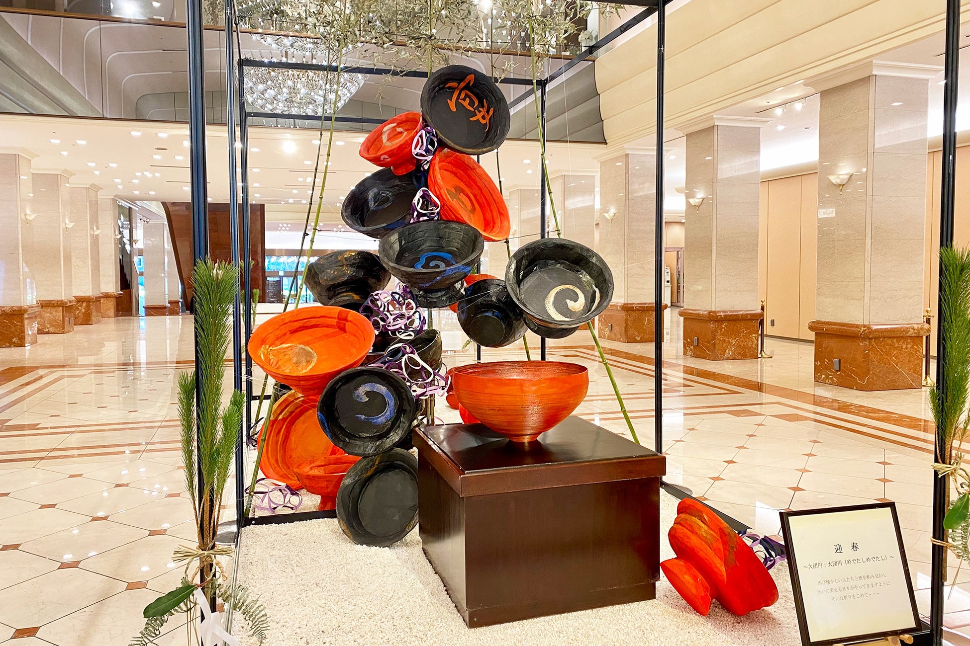 コロナ禍で迎える三度目のお正月。遠くに暮らすご両親や兄弟、親しい友人にもなかなか会えない日々が続くなか、再び懐かしい人たちとお酒を酌み交わし、大いに笑える日々がやってくるように願いを込めて企画いたしました。ロビー中央の幅2m×奥行5m×高さ3mの空間に、漆を施した大きな盃をいくつも重ねることで生命力を表し、添えられた竹には困難なこの時代を強くしなやかに生き抜くイメージが込められています。漆造形家のいらはらみつみ氏による作品は、漆のもつ魅力を引き出し、ダイナミックな世界観が表現されています。