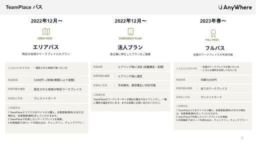 現在、「エリアパス」と「法人プラン」の2種類がございます。また、2023年春ごろから全国のワークプレイスで利用可能な「フルパス」も公開予定です。