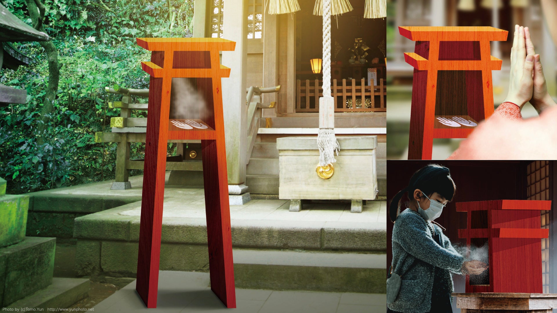 失われつつある伝統的体験を、新たな生活様式に合わせ変換するのが本プロダクトである。どの施設にも入り口で設置されている「消毒」という事務的になりがちな工程に着目。施設の入り口に、鳥居をモチーフとした筐体とお祓い・お清め済みの消毒液を設置。手をかざすと自動で噴射され、そのまま手を合わすことで両手にくまなく塗布することができる。